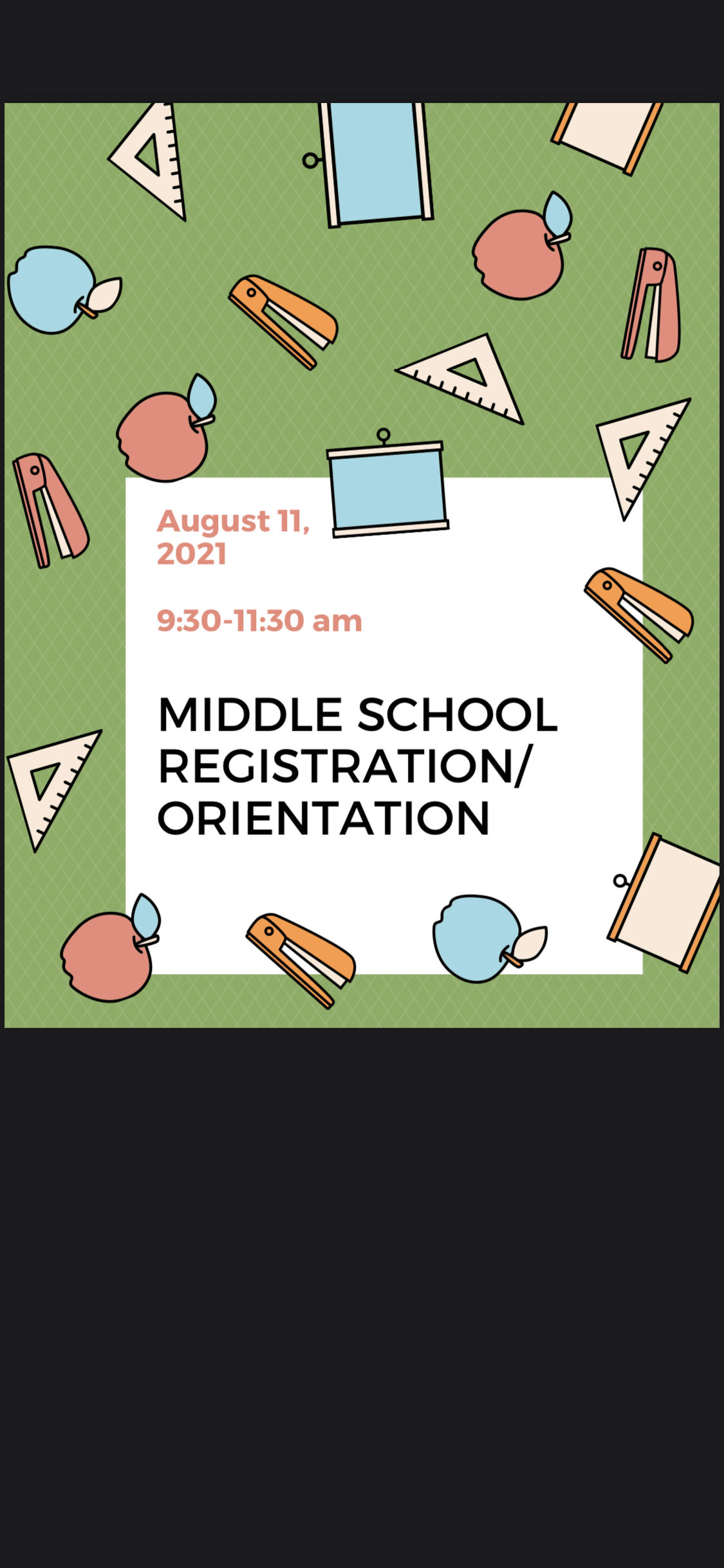 Middle School Registration/Orientation Posted on August 1, 2021 by leannewms Share this: Click to share on X (Opens in new window) X Click to share on Facebook (Opens in new window) Facebook Like Loading... Related
