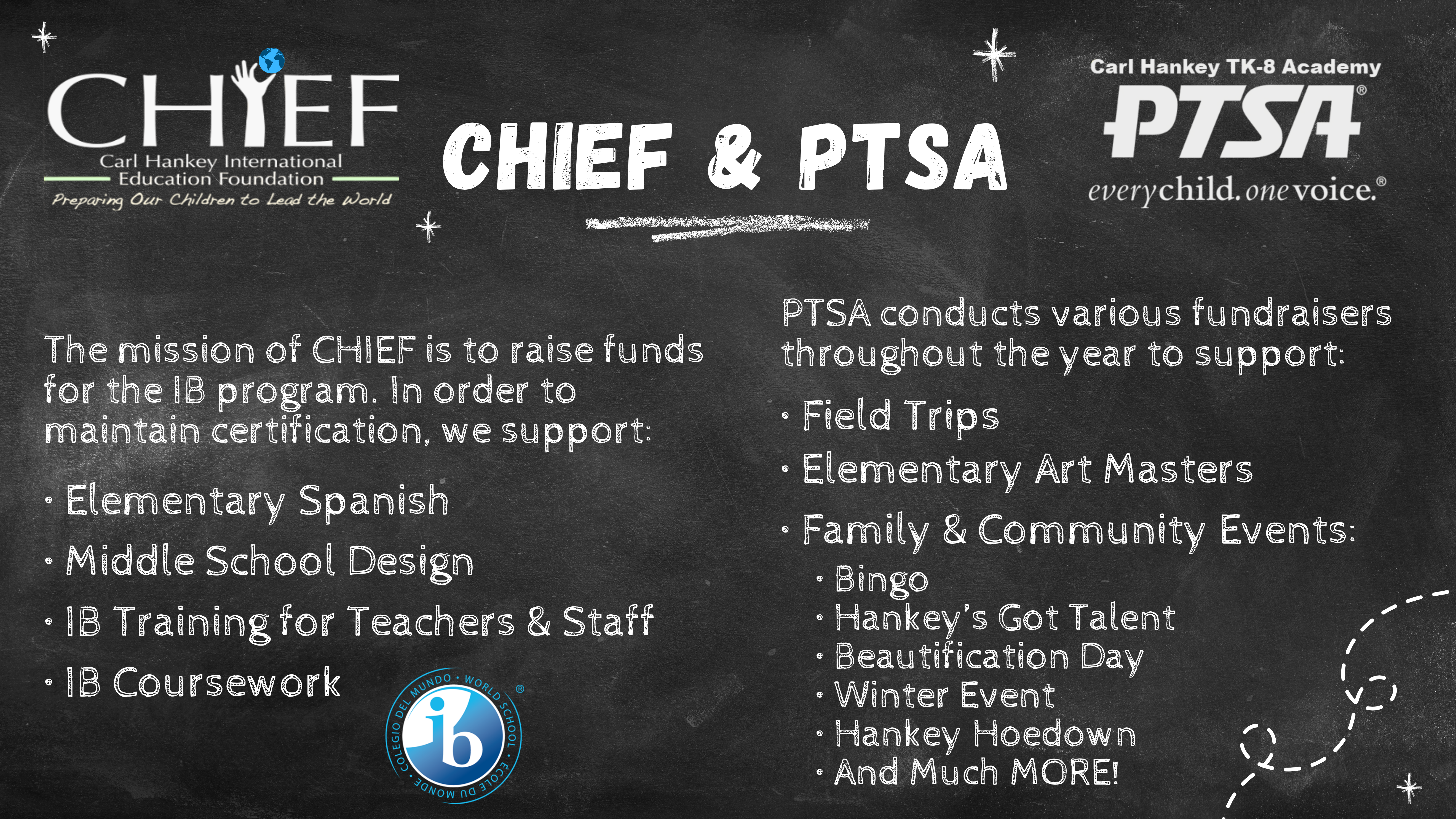 The Carl Hankey PTSA and the CHIEF (Carl Hankey International Education Foundation) are two organizations that support Carl Hankey TK-8 Academy in different ways with the common objective of creating an excellent school environment. Your support of both of these organizations is very much appreciated.